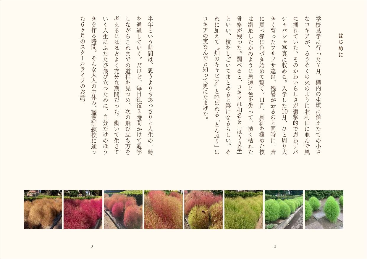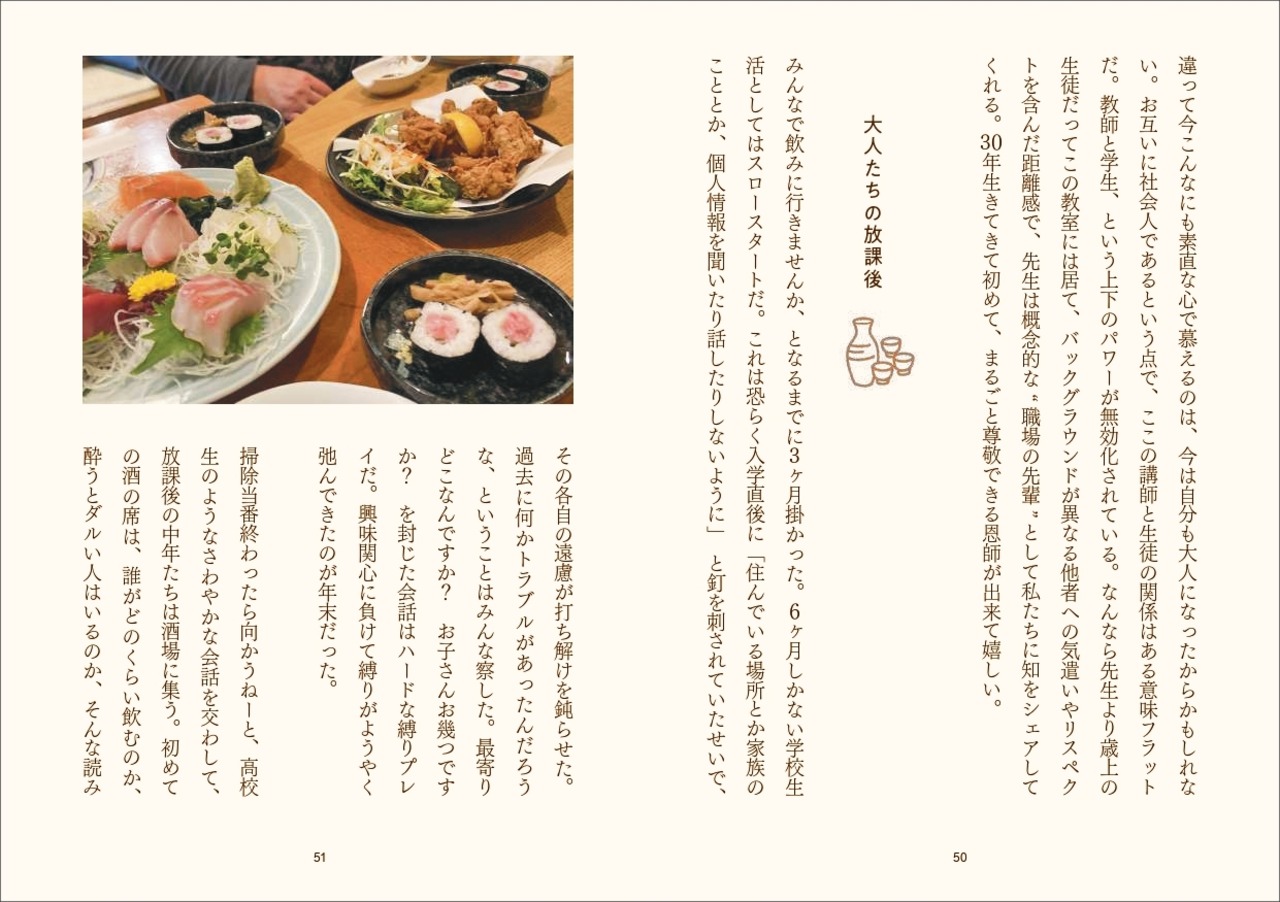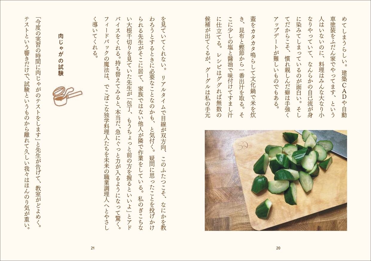 30歳、学生になる / 月金9時16時半 / 調理実習 / 無重力教室 / 10日目のダウン / 給食室の小人 / 板の前の姿勢 / 肉じゃがの試験 / 食べるお守り / 給食と再会 / ケアと嗜好の間 / 役探し / 富士山は誰にも / 歩くセラピー / はたらく訓練 / おいしいは主観 / 現場ごっこ / リトルかっぱ橋 / 先輩としての先生 / 大人たちの放課後 / 進路のムード / ハローワーク出張所 / そこに居ないとできない仕事 / 17時台の酒場 / くれぐれも気をつけて
