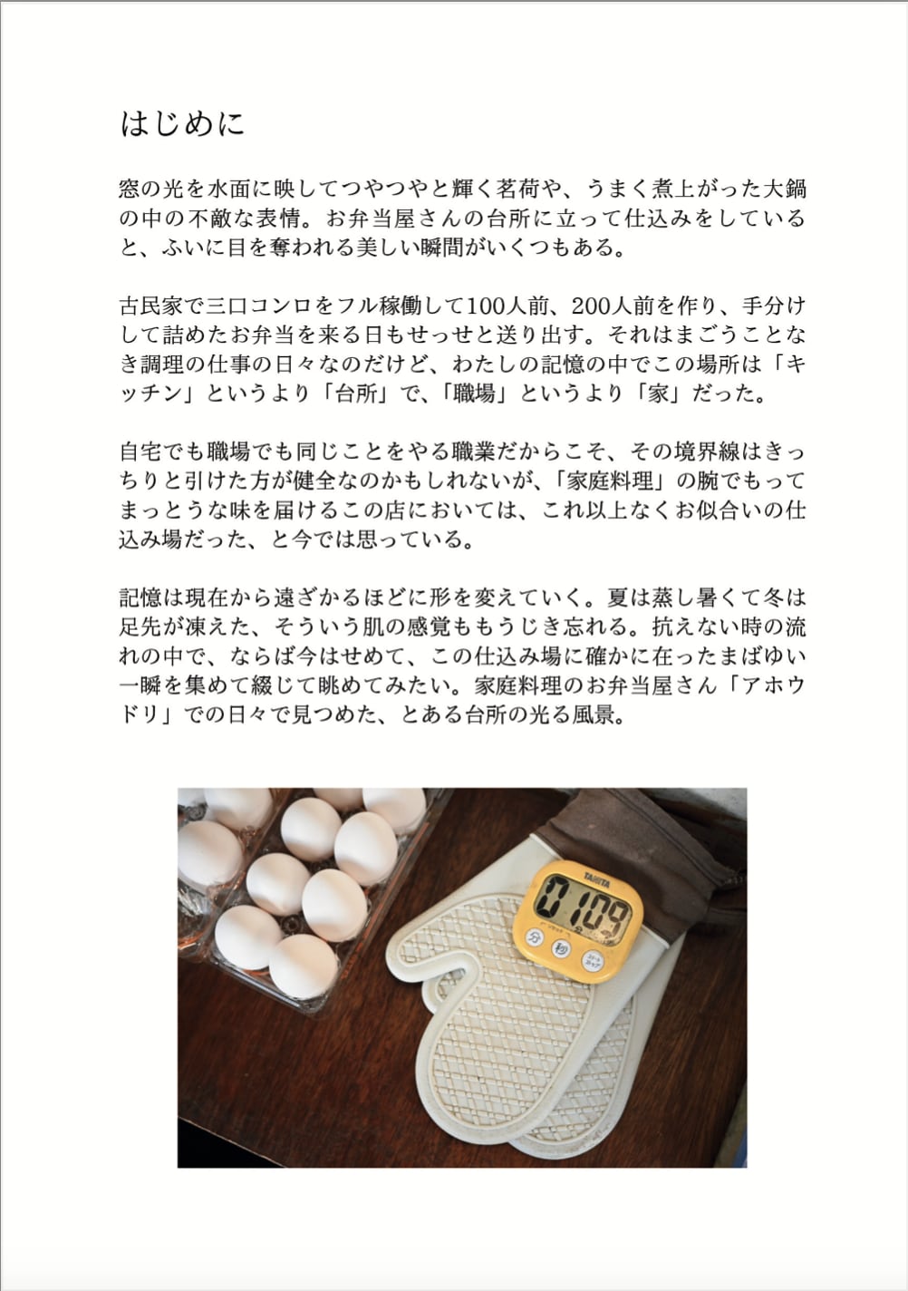 家庭料理のお弁当屋さん「アホウドリ」は、要町の小さな古民家でお弁当を作っていた。キッチンというより台所と呼ぶのが似合うこの調理場に、確かに在ったまぶしい瞬間を閉じ込めたフォトブック。働き始めてからおよそ600日を過ごした後の手ごたえと実感を2篇のエッセイに収録。